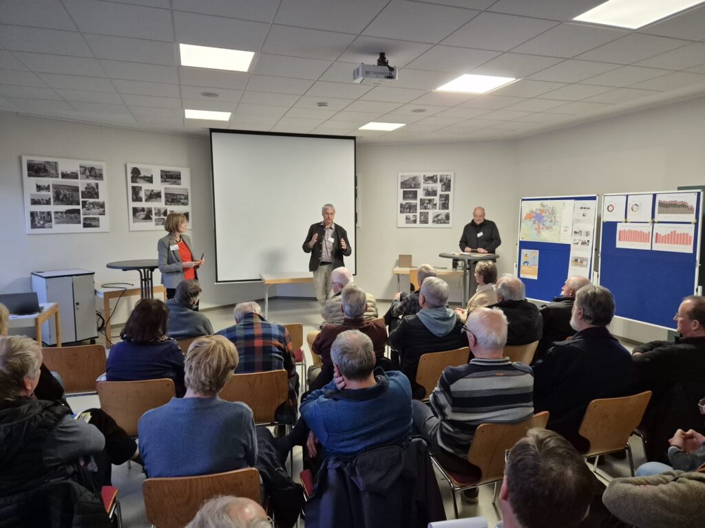 Am vergangenen Freitag war der Nachhaltigkeitsverein “Detmold 2035” in Diestelbruch zu Gast. Von 15 bis 18 Uhr gab es Vorträge zur nachhaltigen Dämmung von Wohnhäusern, zu der Frage, welche CO²- neutralen Heiztechniken eingesetzt werden können, und wie die Wärmeplanung für Detmold und seine Ortsteile aussieht. Die Wärmeplanung für Detmold ist abgeschlossen. Klar ist, dass das Fernwärmenetz für den Kernstadtbereich ausgebaut wird und die Ortsteile wie Diestelbruch nicht einbezogen sind. Insofern müssen sich alle Diestelbrucherinnen und Diestelbrucher die Frage stellen: „Welche Wärme für mein Haus?“ – So der Titel der Veranstaltung! Wenn eine neue Heizung fällig ist, muss für jedes einzelne Haus die beste eigenständige Lösung für ein nachhaltiges Heizkonzept gefunden werden. Zweiunddreißig Diestelbrucherinnen und Diestelbrucher haben die Vorträge aufmerksam verfolgt und im Anschluss viel nachgefragt und diskutiert. Vor dem Treffpunkt standen zwei Ausstellungsfahrzeuge bereit, in denen moderne Heiz- und Klimageräte von Fachleuten gezeigt und erklärt wurden. Bei frischen Temperaturen wurde noch lange diskutiert und gefachsimpelt.