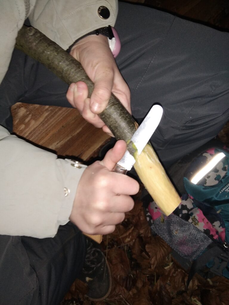 Ein weiterer Höhepunkt: unsere ersten Schnitzerfahrungen. Nach einer Einführung in die Messerkunde haben wir im Wald Stöcke entrindet und angespitzt. Im Frühling wollen wir das Schnitzen weiter vertiefen und vielleicht schon die ersten kleinen Holzwerke gestalten.