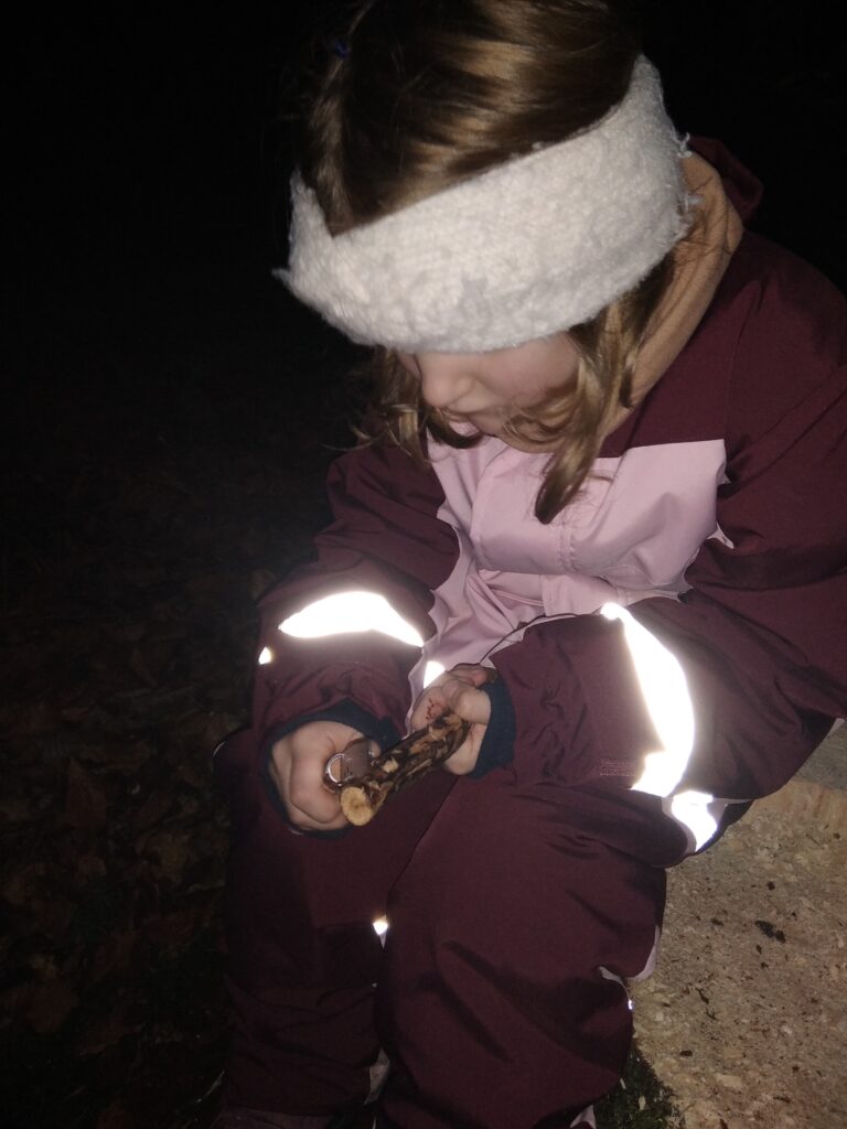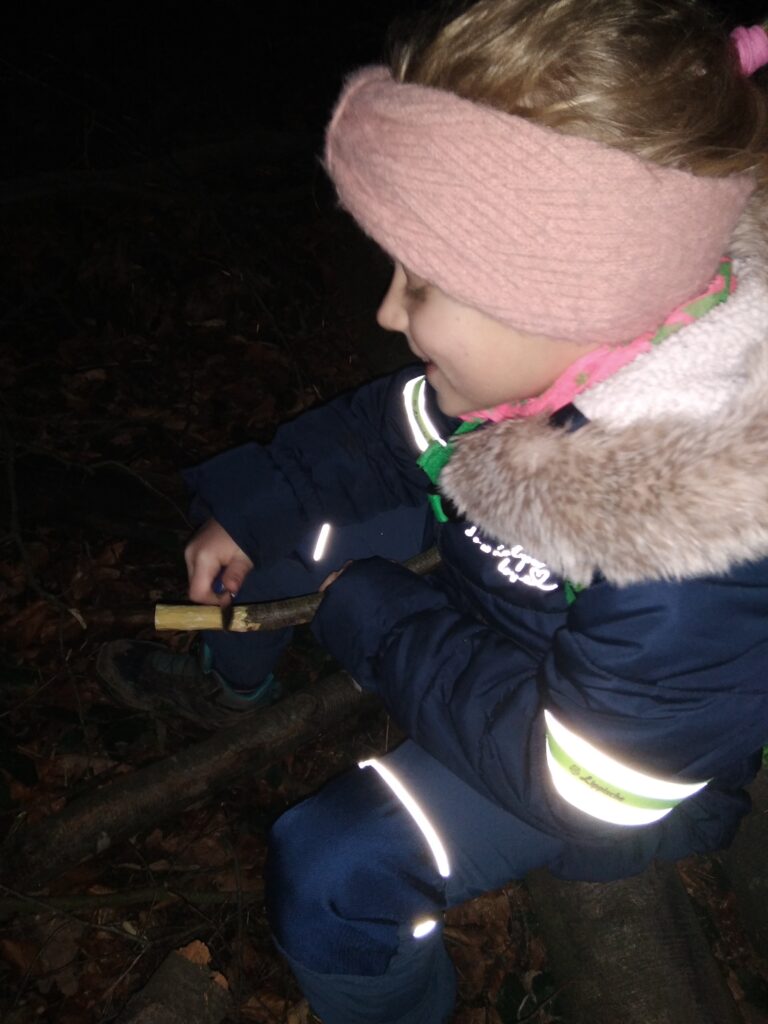 In der dunklen Jahreszeit wagen wir regelmäßig kleine Dunkelwanderungen. Ohne Taschenlampen – so gut es geht – schärfen wir unsere Sinne und lernen, mutig zu sein und die Grenzen der anderen zu respektieren.