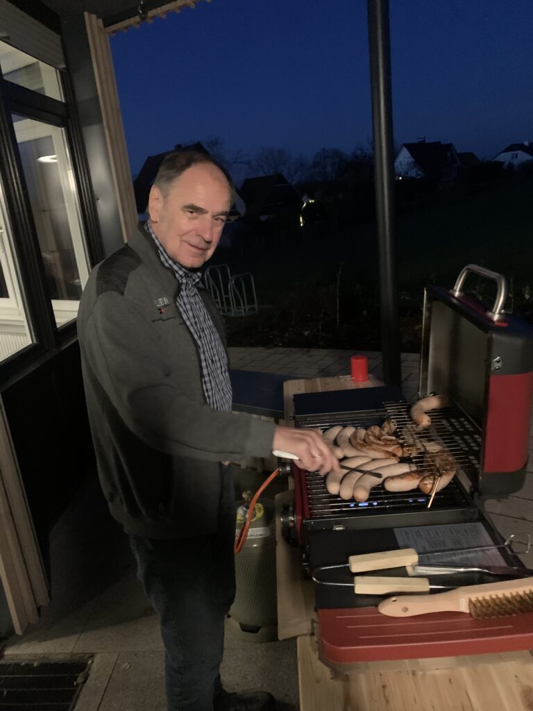 Und dieser Ausklang konnte sich wirklich sehen lassen – denn unser neuer Gasgrill wurde feierlich eingeweiht. Ruckzuck hatten Dieter und Erwin die Würstchen heiß und braun, dazu gab es frische Brötchen. Ein gut gekühltes Veltins stand selbstverständlich auch bereit, damit niemand verdurstet.
