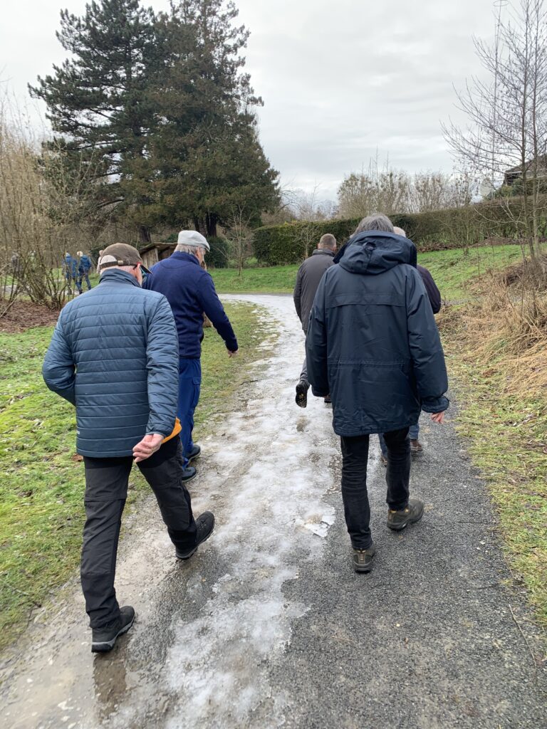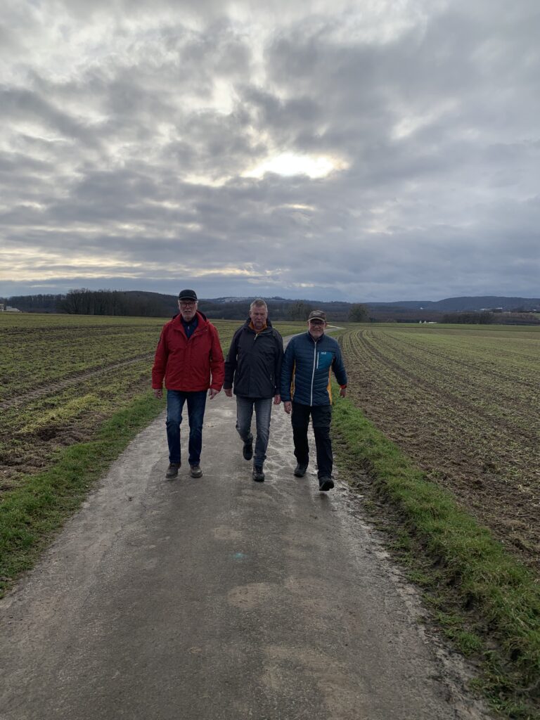 Wie immer führte Hans die Gruppe sicher und mit viel Erfahrung durch die Landschaft. Der Weg verlief entlang der Werre, weiter in Richtung Wasserturm, vorbei am Flugplatz und schließlich in einem großen Bogen zurück zum Ausgangspunkt. Teilweise waren die Wege noch leicht vereist, doch das stellte für niemanden ein Problem dar.