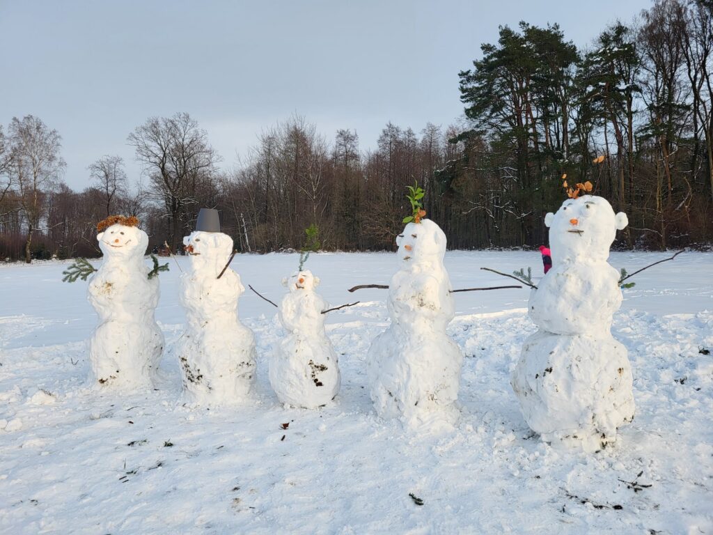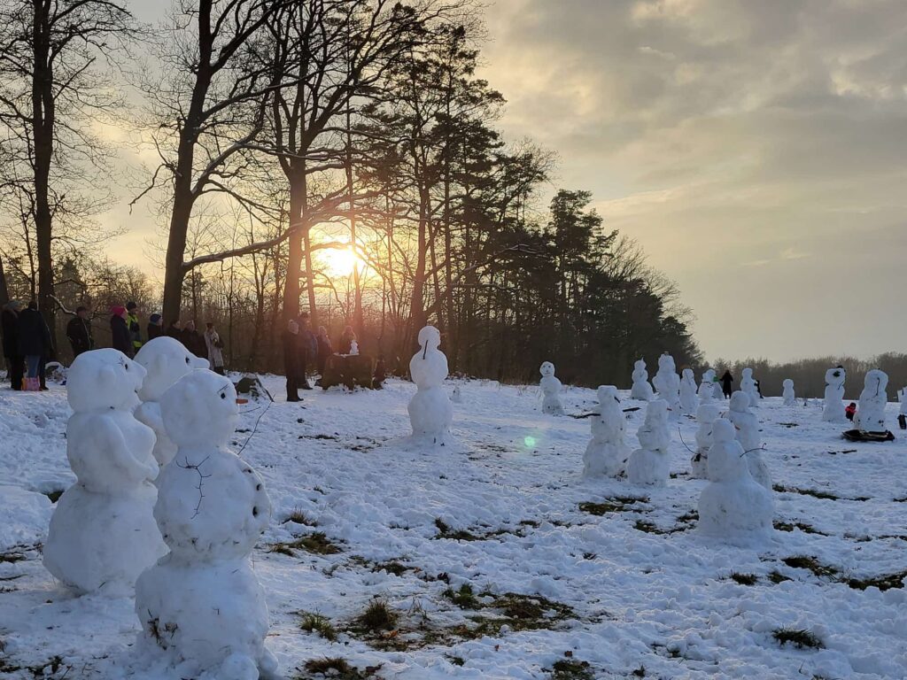 57 Schneemänner am Rand des Leistruper Waldes.