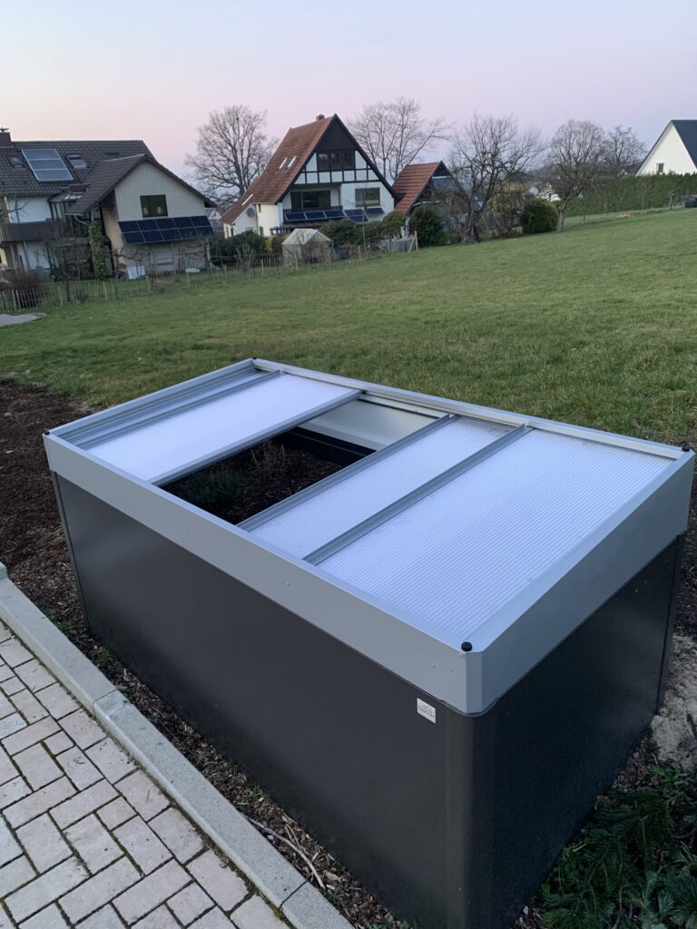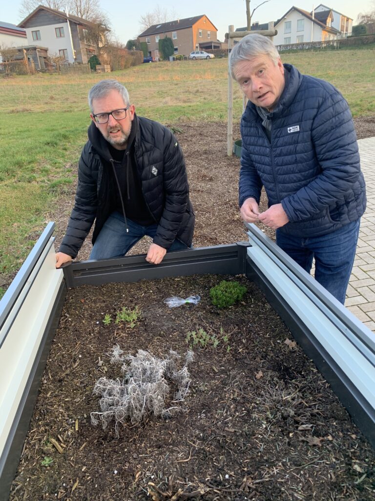 Zu tun gab es reichlich. Unser Hochbeet wurde aufgerüstet und hat nun einen Frühbeet-Aufsatz bekommen. Ohne Anleitung – aber mit viel Erfahrung und einer guten Portion Improvisation – haben Stephan, heute ein gern gesehener Gast im Team, und Andreas das Ganze zusammengebaut. Am Ende stand das neue Frühbeet stabil an seinem Platz.
