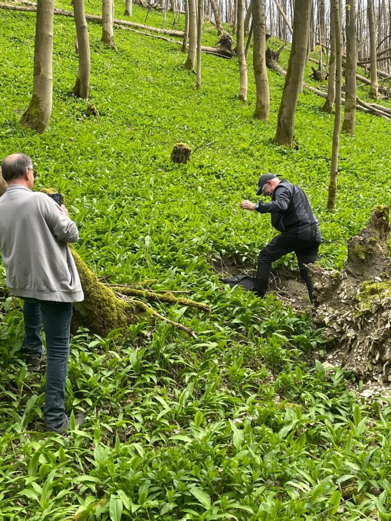 Thomas hatte sich darauf besonders gefreut – und war bestens vorbereitet. Mit „schwerem Gerät“ im Rucksack (einem Esslöffel!) ging es ans Werk. Unter fachkundiger Beobachtung von Dieter wurden vorsichtig ein paar Pflanzen ausgegraben.